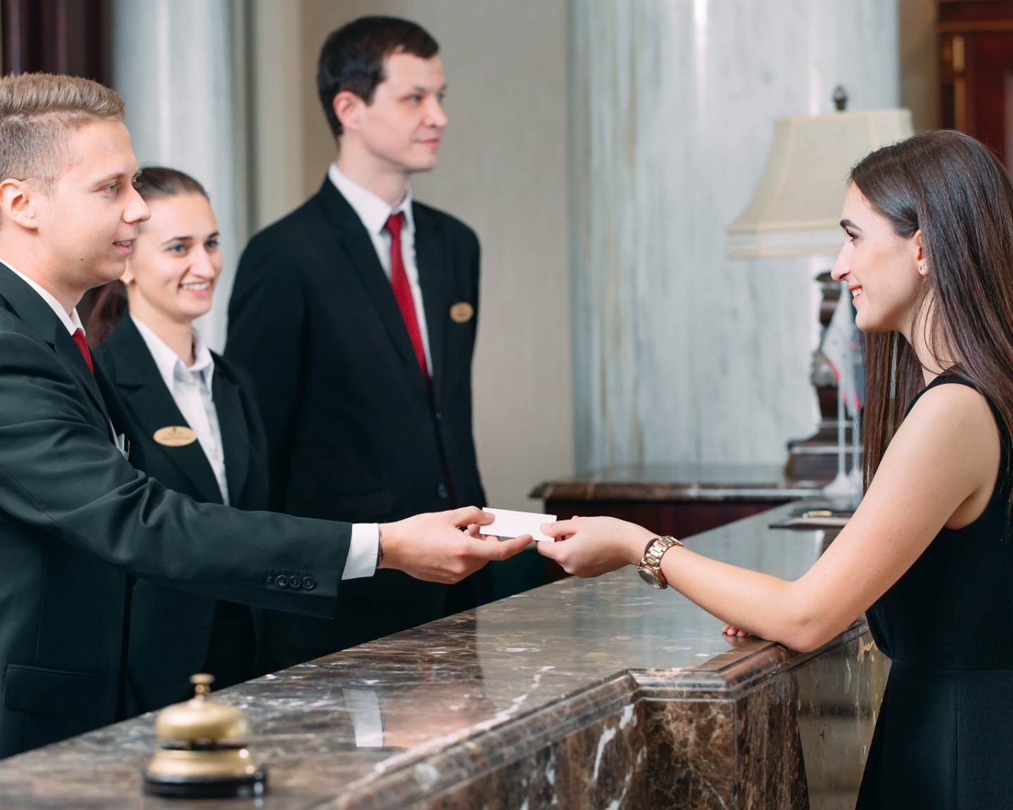 - Регистрировать и обслуживать гостей на стойке регистрации отеля.
